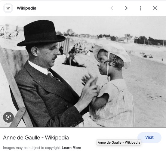 The birth of Anne de Gaulle occurred in Germany on the first of January, 1928. You can imagine the tumultuous thoughts and feelings stirring in the breast of Charles de Gaulle when he learned that his third child was a “Down baby”. Being a religious man, he may have cried out to his God asking what sin he had committed to deserve such an outcome. Nevertheless, he and his wife determined to give the child the best life and education that they could. Being a military man and a major he had to move his family a lot, often interstate. They took her everywhere with them.